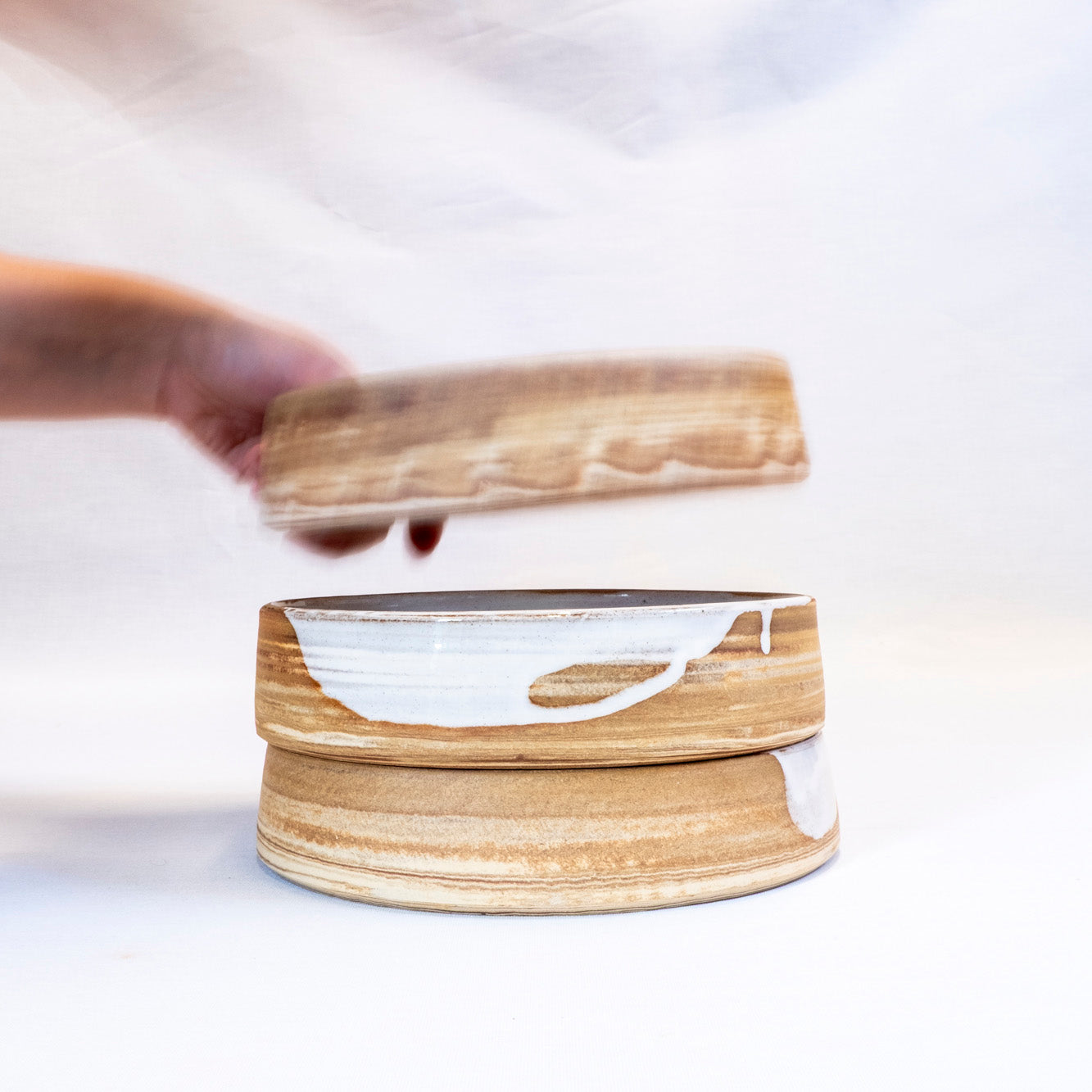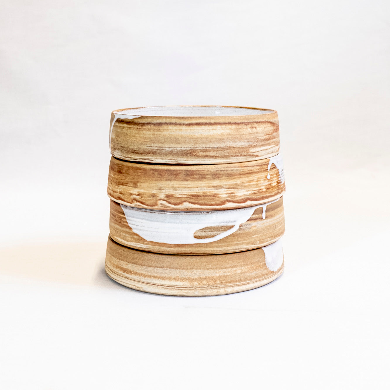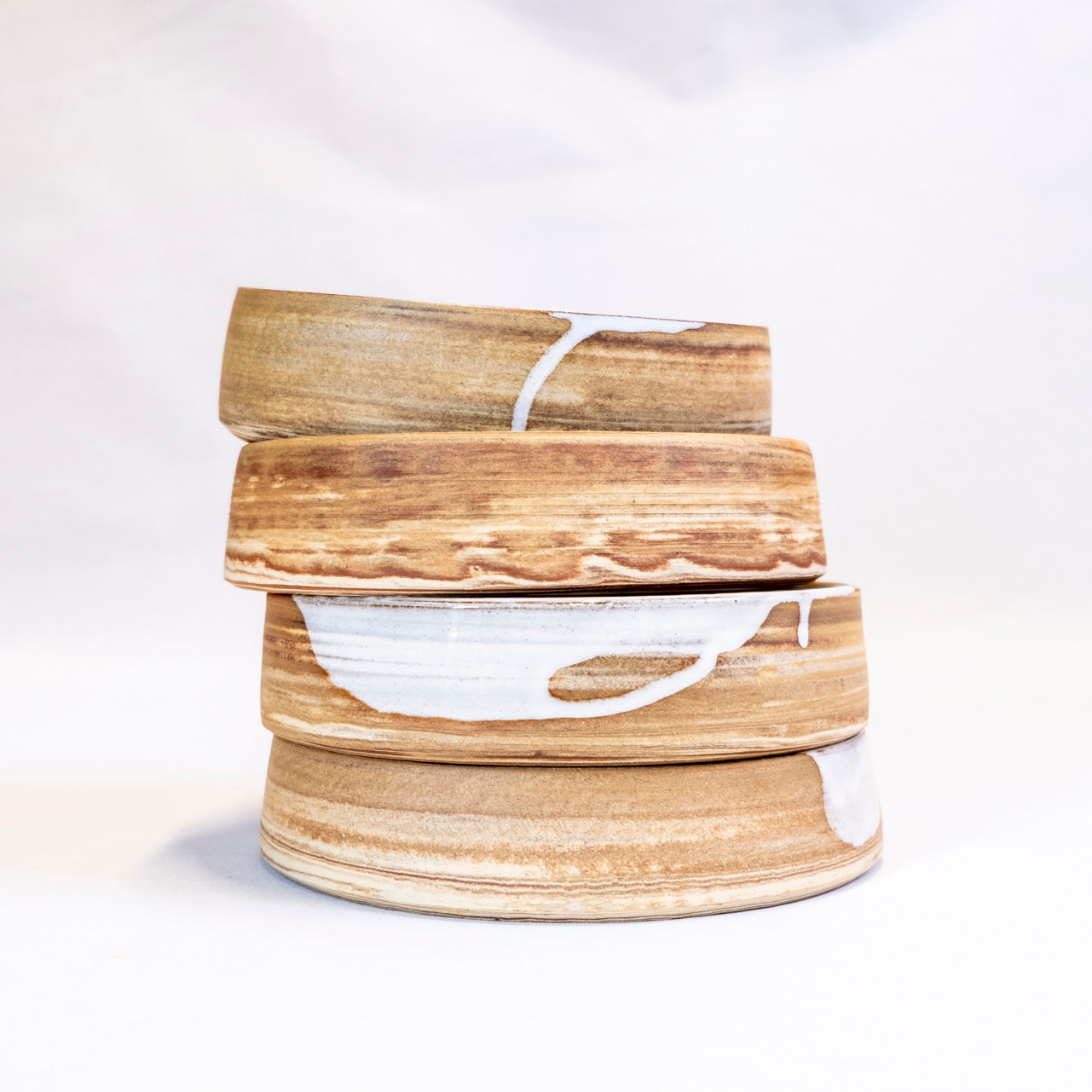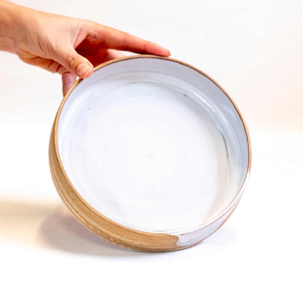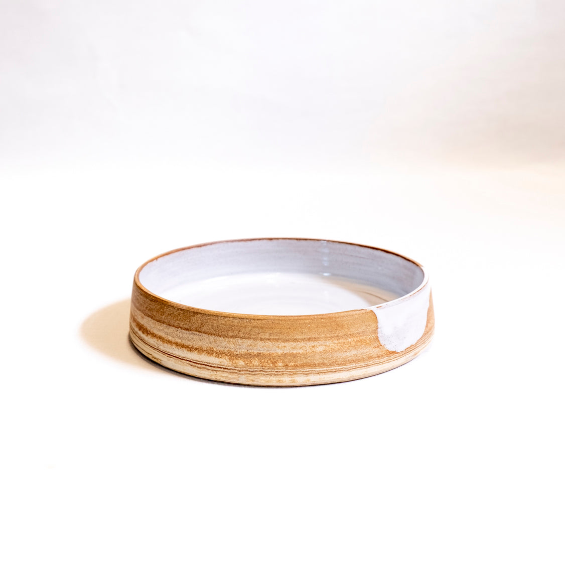 Diepe borden, ideaal voor heerlijke pasta, gedraaid met witte en rode klei. De binnenkant afgewerkt met glanzende witte glazuur.