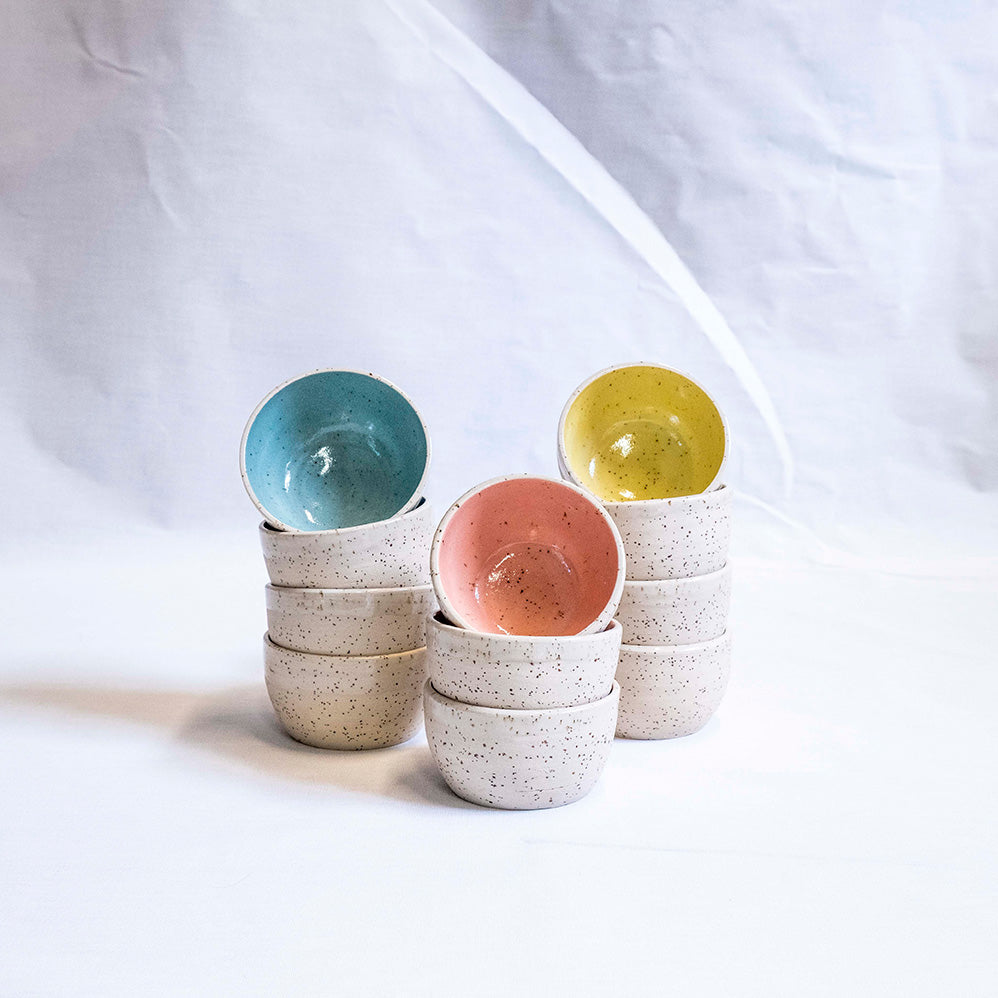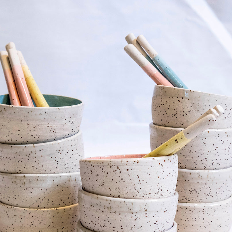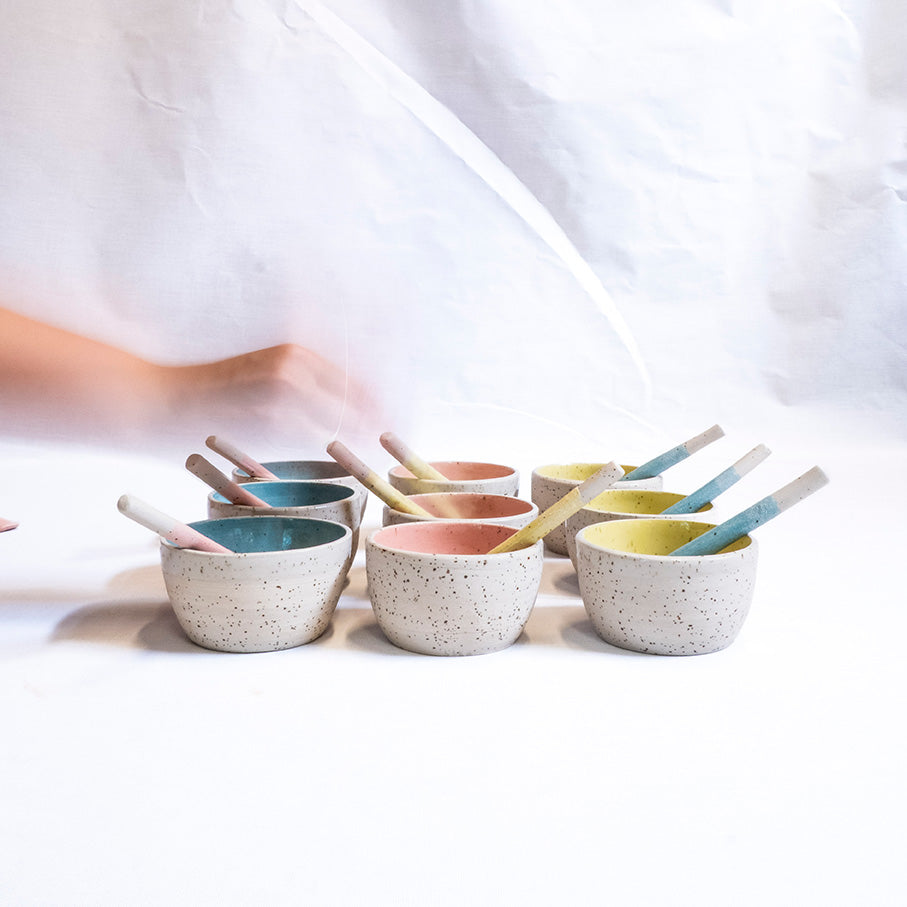 De kommetjes zijn gedraaid uit spikkelklei en afgewerkt met een speelse, kleurrijke engobe. De lepeltjes zijn met de hand gevormd en verkrijgbaar in drie frisse tinten.