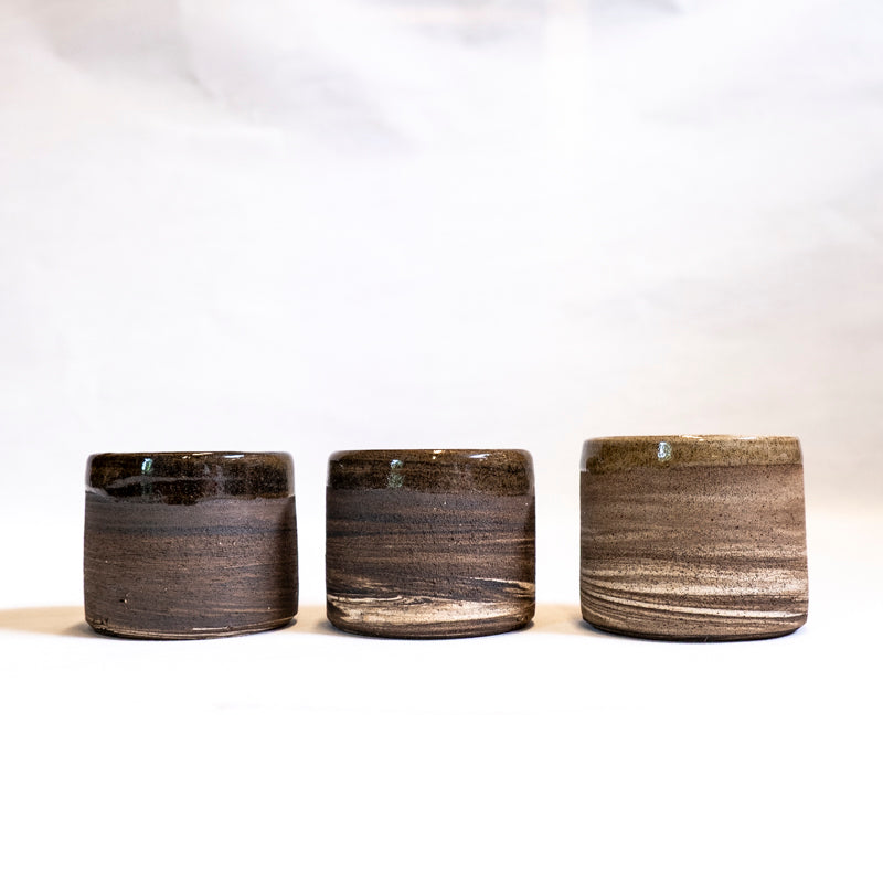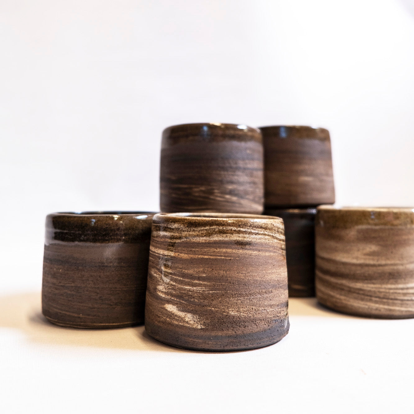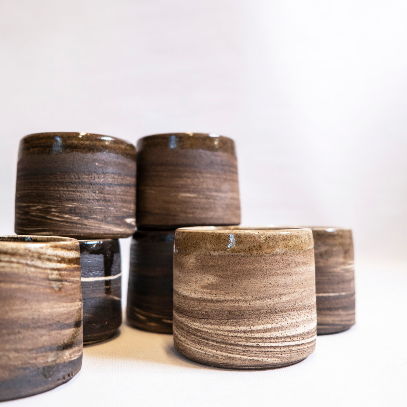 Fijne tasjes gemaakt met een mix van zwarte en witte klei. Elk stuk is hierdoor uniek. We werken het tasje af met transparante glazuur.